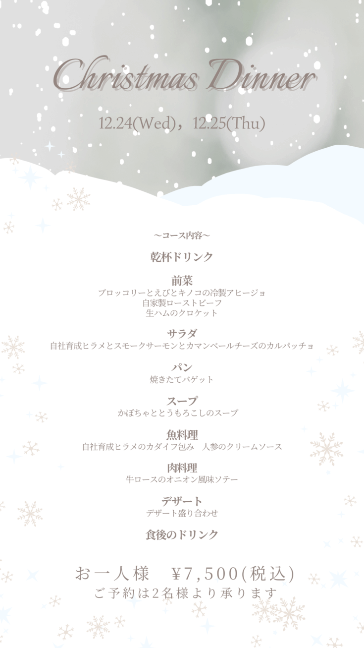 期間中のディナー営業はクリスマスディナーコースのみのご案内になります。
