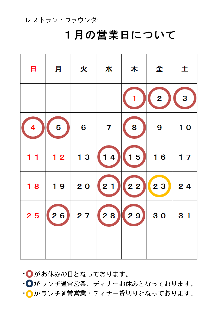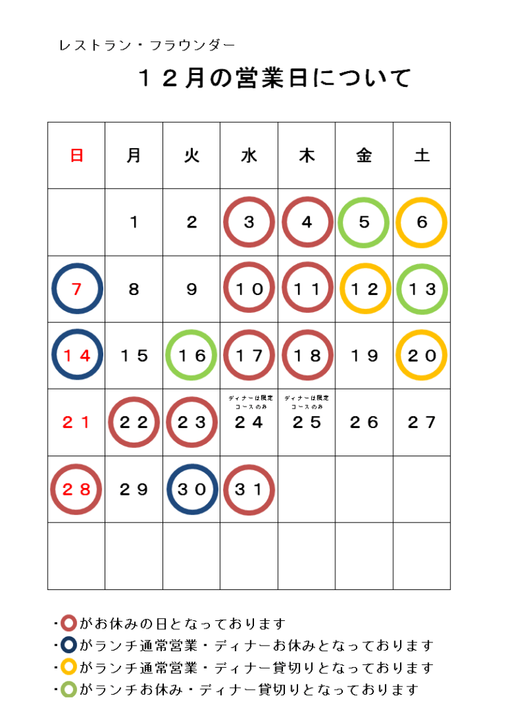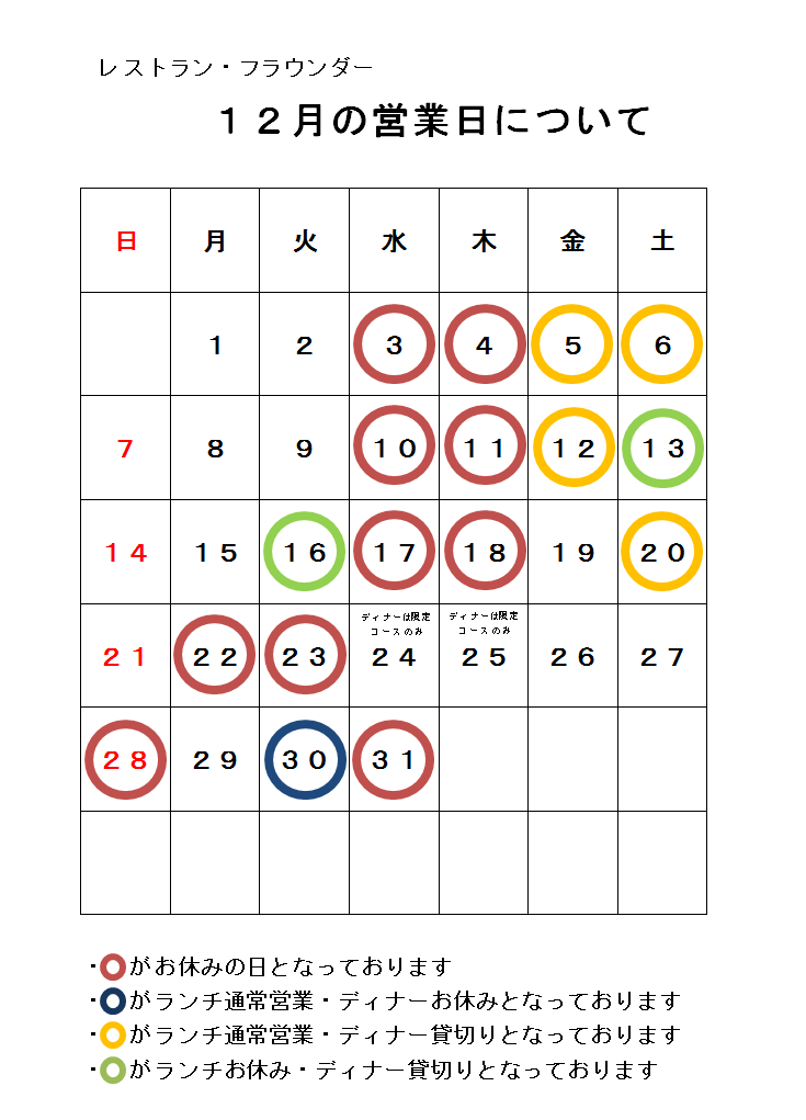 12月の店休日は、3日(水)、4日(木)、10日(水)、11日(木)、17日(水)、18日(木)、22日(月)、23日(火)、28日(日)、31日(水)となっております。
