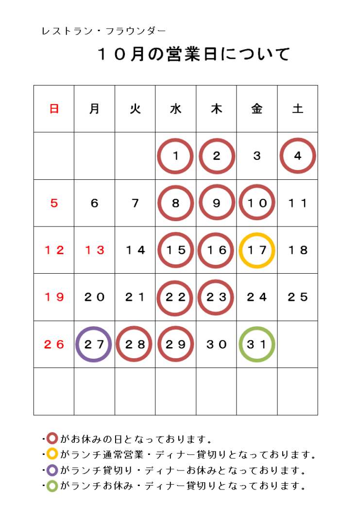 10月の店休日は、1日(水)、2日(木)、8日(水)、9日(木)、10日(金)、15日(水)、16日(木)、22日(水)、23日(木)、28日(火)、29日(水)となっております。