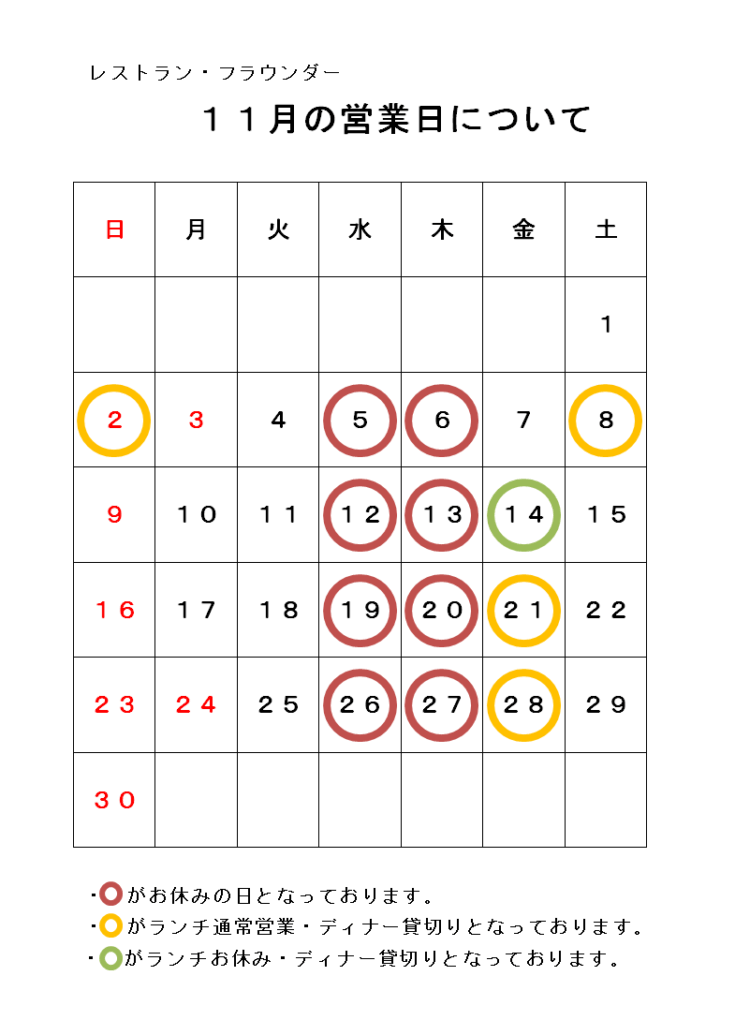 11月の店休日は、5日(水)、6日(木)、12日(水)、13日(木)、19日(水)、20日(木)、26日(水)、27日(木)となっております。