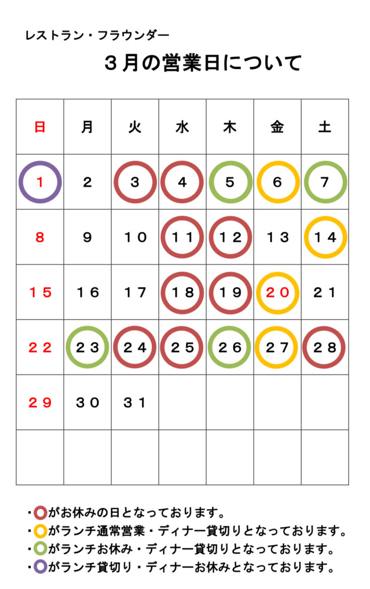 3月の店休日は、3日(火)、4日(水)、11日(水)、12日(木)、18日(水)、19日(木)、24日(火)、25日(水)、28日(土)となっております。